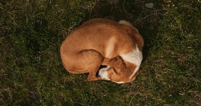 What it looks like: Similar to the curled ball, but tighter. Muscles look stiff rather than soft. Paws are tucked under rigidly. The dog may flinch or startle easily when touched.